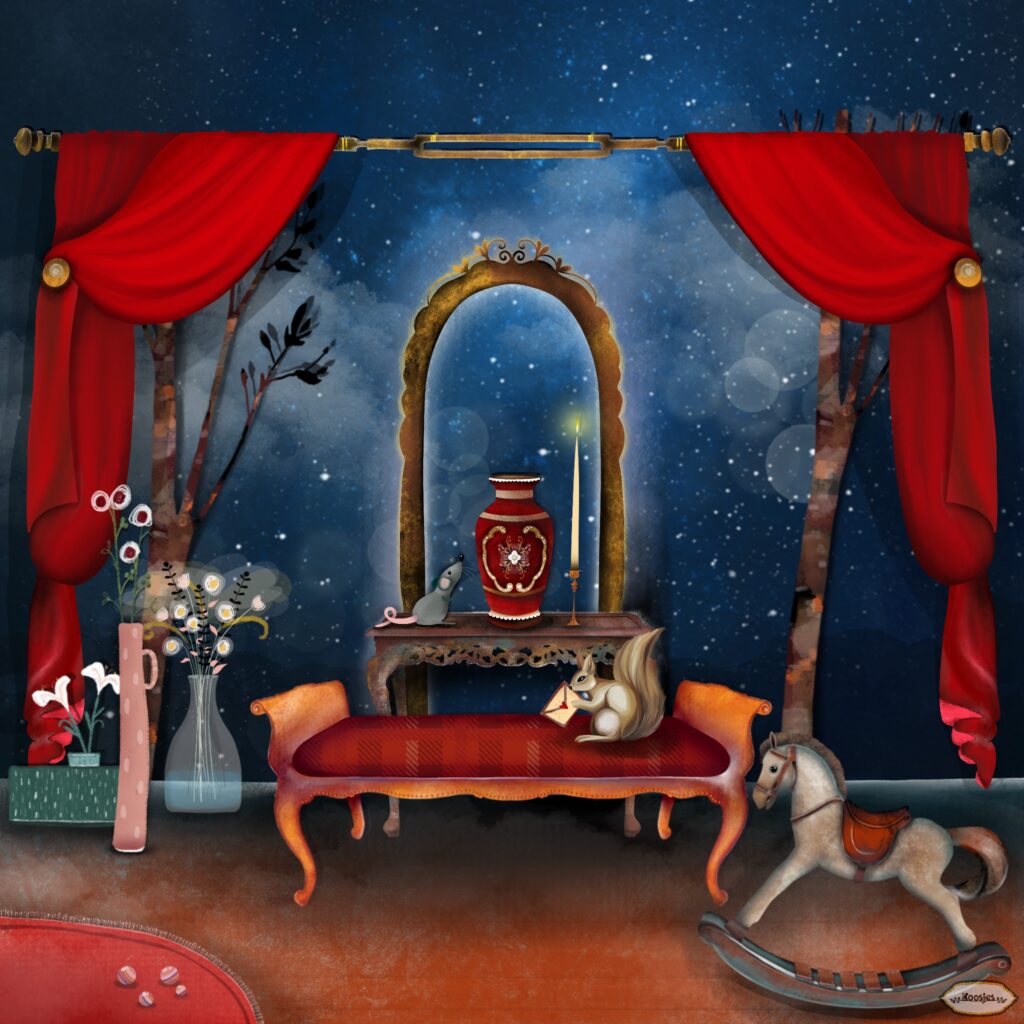 In mijn hoofd verzin ik altijd verhalen bij mijn tekeningen. Onderstaande tekeningen maakte ik tijdens de avondklok tijd in. Normaal repeteer ik 3 avonden per week maar dat mocht niet en om die reden had ik meer tijd om eens goed naar mijn eigen huiskamer te kijken. En wat zich daar allemaal afspeelt? Ik had werkelijk geen idee. Er wonen mensen, dieren en wezens in mijn huis die ik nog nooit eerder heb ontmoet. Naast mijn kast zijn ineens huizen, de muren verdwijnen en buiten wordt binnen, er wordt geschaatst over mijn vloer en het hobbelpaard komt tot leven. Een muis en een eekhoorn delen hun liefde door middel van briefjes die ze voor elkaar achterlaten en de nachtegaal zingt elke avond om 23.00 uur vanaf mijn kast. Er wordt gedanst, gezongen en muziek gemaakt. Elke avond verwonder ik me over het tafereel wat zich afspeelt. Deze Lock down brengt me misschien wel wat goeds. Dingen zien die ik nooit eerder zag……gewoon omdat ik beter kijk. (note to myself: Ik ga hier echt een boek van maken).